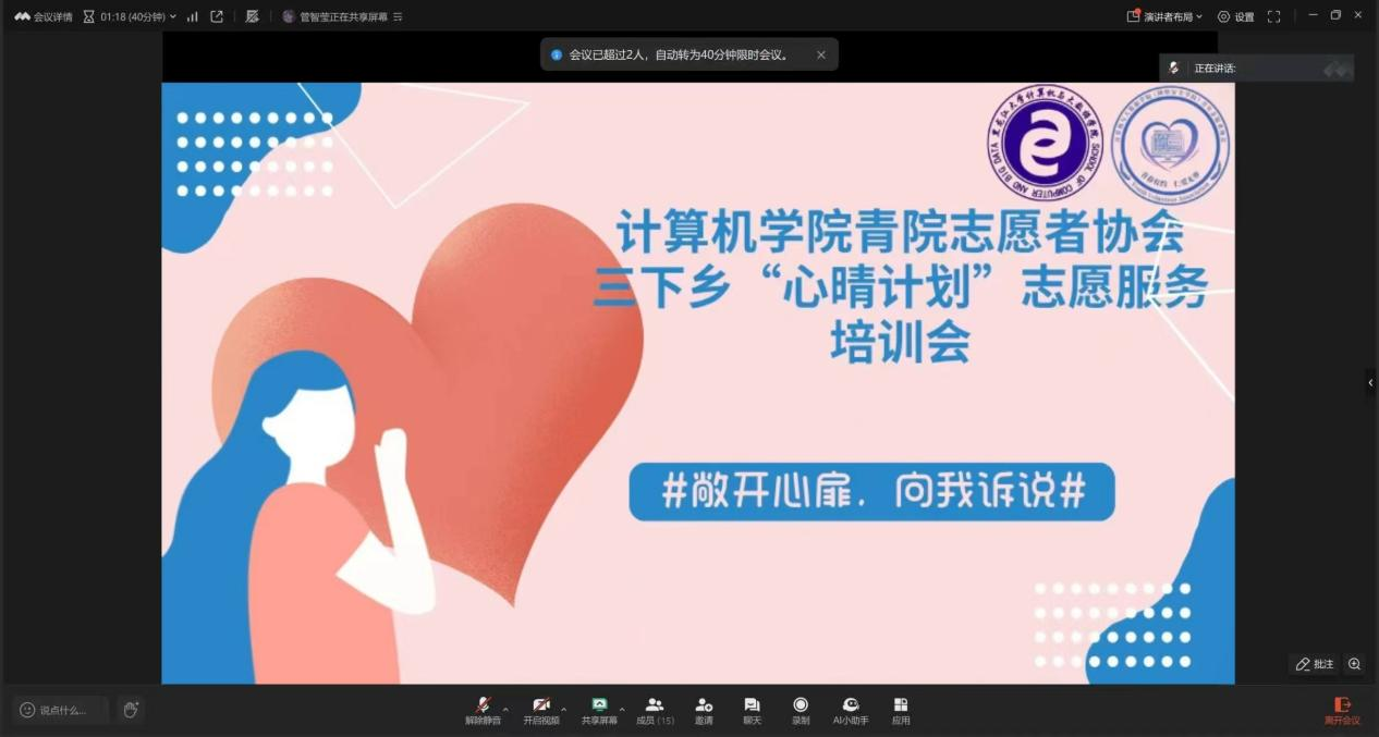 为进一步提升心晴计划下乡志愿者队伍的专业服务能力,明确下乡服务的核心任务与工作规范,确保各项帮扶活动精准落地、高效开展,心晴计划(下乡)专项培训会于 2025 年 7月 17 日在学院四号楼会议室顺利召开。心晴计划项目负责人、指导老师及全体下乡志愿者共同参与本次培训。