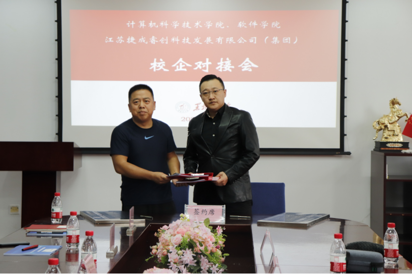 随后,张立才老师就公司业务范围,人才岗位需求等问题与企业展开深入交流。他表示,互联网行业形势严峻,今年较往年相比岗位少、竞争大,我院学生踏实好学,希望企业能与我院建立长期合作关系,用专项实习培养专门人才,学院也将把就业工作前置,希望企业多给予学生就业机会。会议进行最后一项,张立才老师与陈登辉总经理进行学生实习实训基地签约授牌仪式;马吉权老师与金刚总经理进行图像增强与分析联合实验室签约授牌仪式。相信未来,我院将与捷成睿创建立更深厚、更长效的合作关系,为我院学子开辟就业直通车。