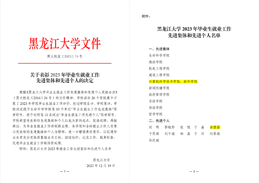 学院计算机学科进入ESI全球前1%,获得国家科学技术进步二等奖1项,拥有国家级教学团队1个,建有第二批全国党建工作样板支部、第三批全国高校“双带头人”教师党支部书记工作室、黑龙江省首批高校“双带头人”教师党支部书记工作室、黑龙江省基层思想政治工作示范点、黑龙江省五四红旗团委。作为黑龙江省专业特色学院,学院拥有黑龙江省重点实验室——数据库与并行计算黑龙江省级重点实验室,黑龙江省专业技术领军人才梯队——网络空间安全,近年发展迅速。