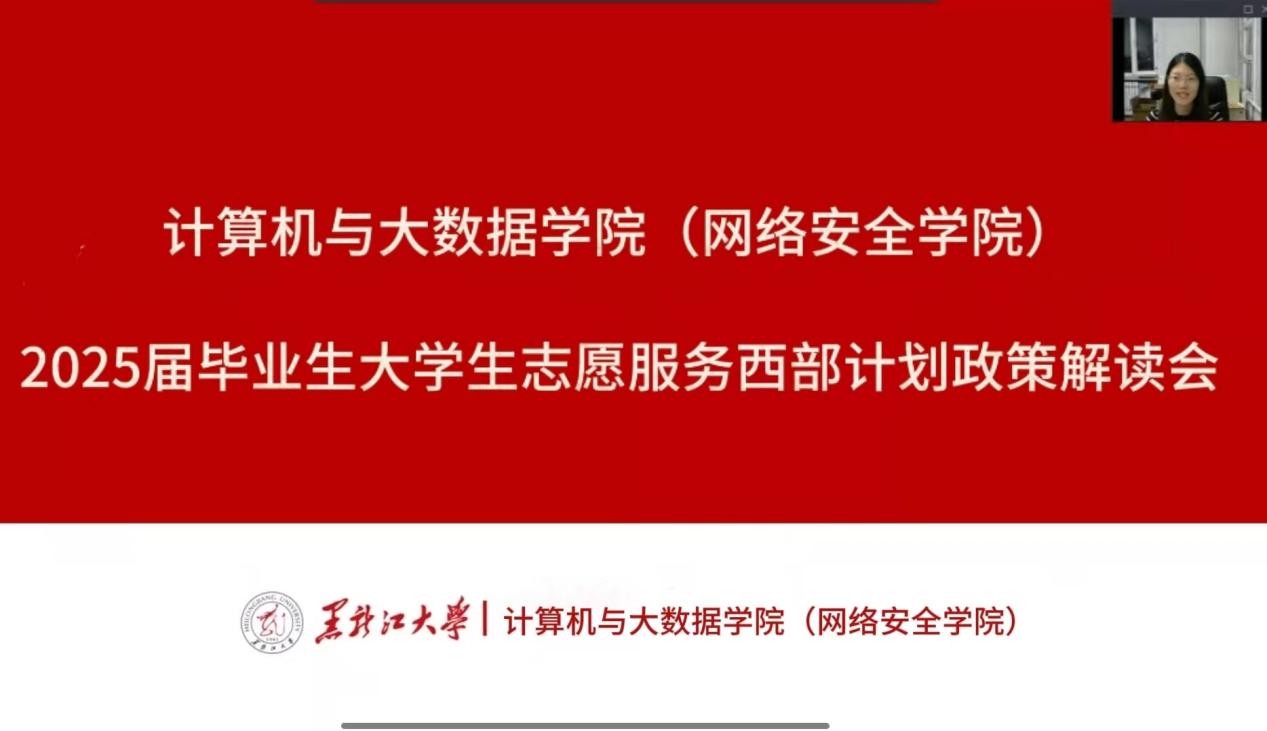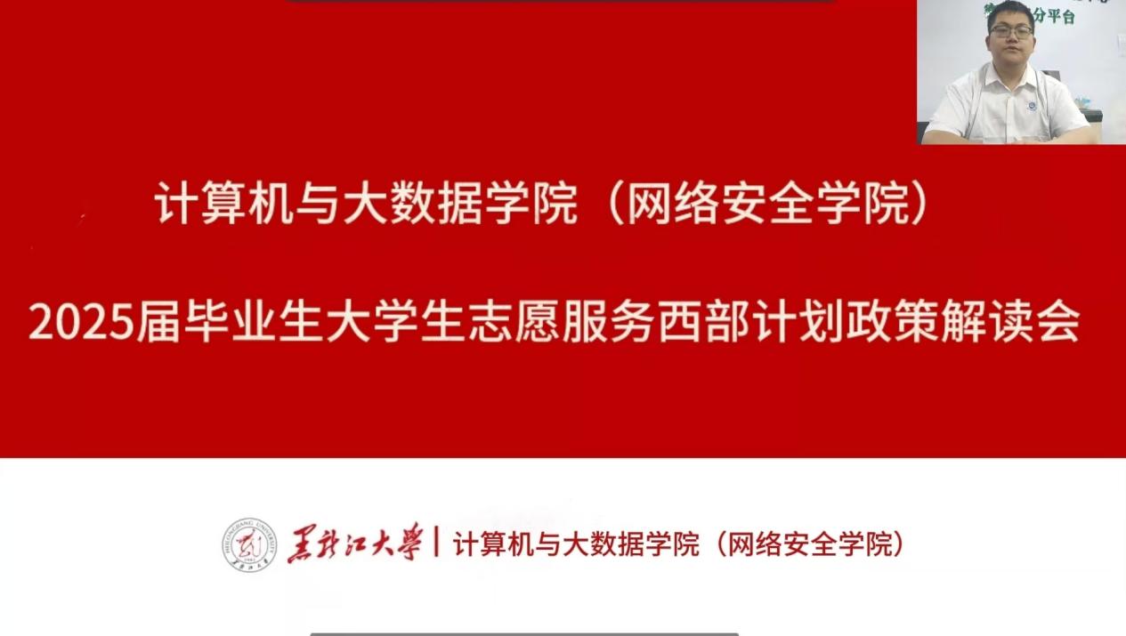 为深入贯彻落实国家大学生志愿服务西部计划政策,引导学院 2025 届毕业生扎根基层、服务社会,计算机与大数据学院于 2025 年 4 月 15 日 14 时以线上形式召开大学生志愿服务西部计划政策解读会。学院 2025 届毕业生辅导员梅天予、程雅婷、赵文晶及毕业生参会,会议特别邀请我校优秀校友柳浩洋分享服务经验。
