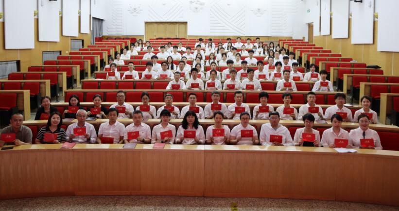 学院党总支书记刘荫梅为新党员佩戴党员徽章,并与党员代表合影留念。